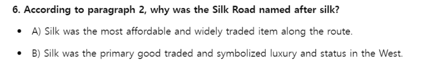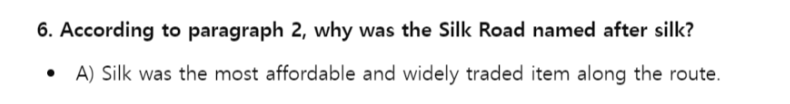 우선, A의 경우 "the most affordable"이 등장하는데, 본 road에서 slik 무역이 이루어진다고만 했지
