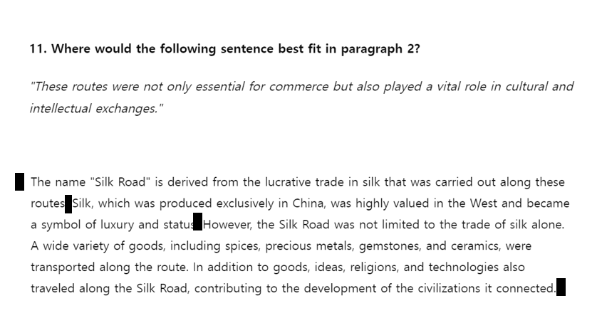 다음으로 문장 삽입 문제 같은 경우에는 넣어야 할 문장을 읽고,