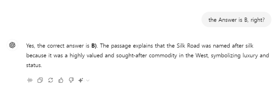보통 지문에 해당 문제에 음영이 표시되는데, 챗GPT는 이렇게 문장을 따로 가져와서 비슷한 의미를 고르라고 하네요..!