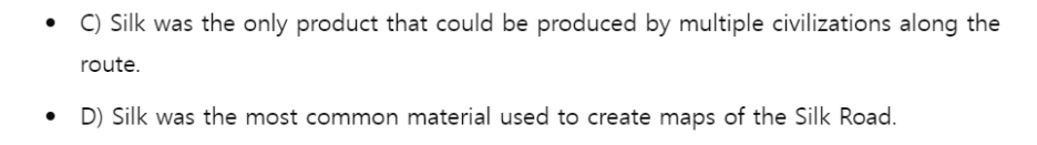 C는 단락 2를 읽어보면 알겠지만 slik road에선 slika 외 다른 물건들도 trade 되었기에 틀린 선지이고,