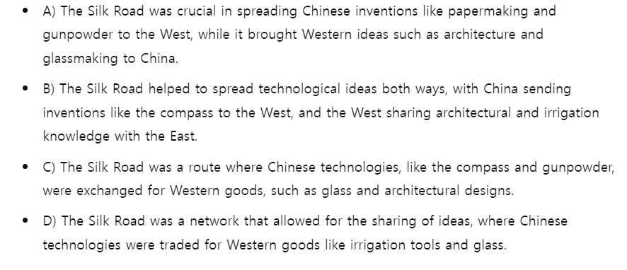 일단 해당 문장에선 "실크로드가 동양과 서양 사이의 기술 혁신의 상호교환을 촉진한다"라는 핵심 내용과 함께 중국의 기술이 서양으로 전파되는 사례, 서양의 지식이 중국으로 전파되는 사례를 서술했는데요,