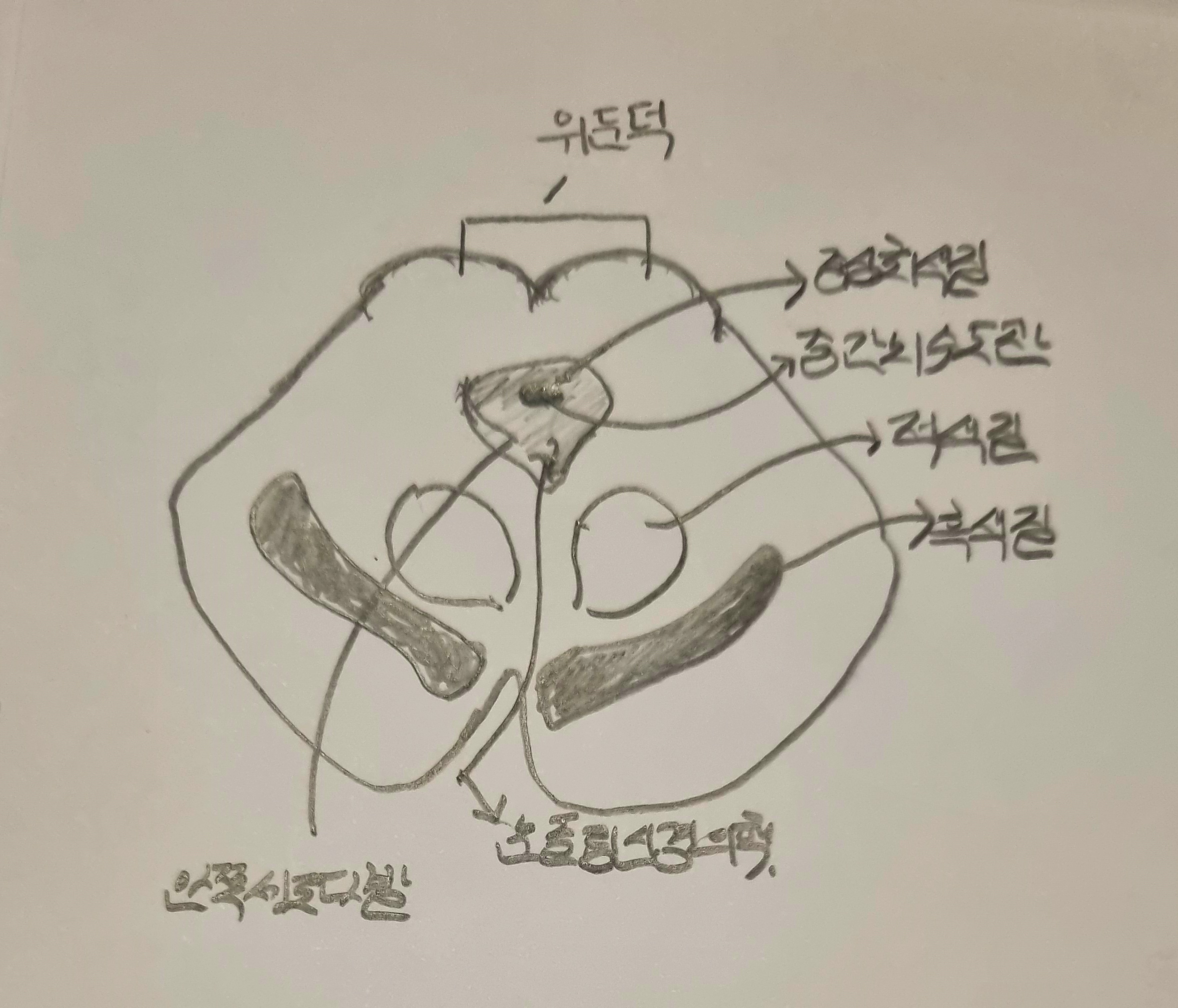 중간뇌는 사이뇌와 다리뇌를 연결하는 부위이며, 대략 다음과 같은 구조를 가집니다.