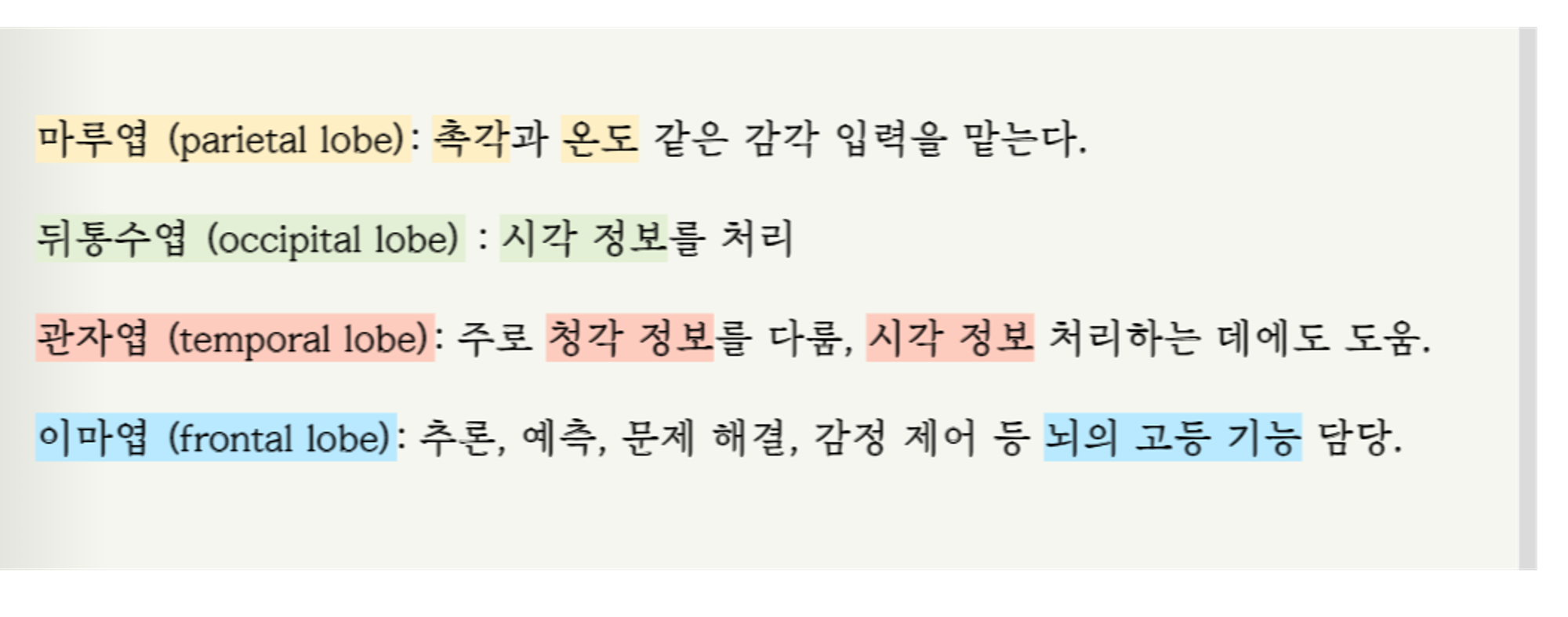 4가지 엽(이마엽, 마루엽, 관자엽, 뒤통수엽)으로 나뉘며 설명과 이미지는 다음과 같습니다.