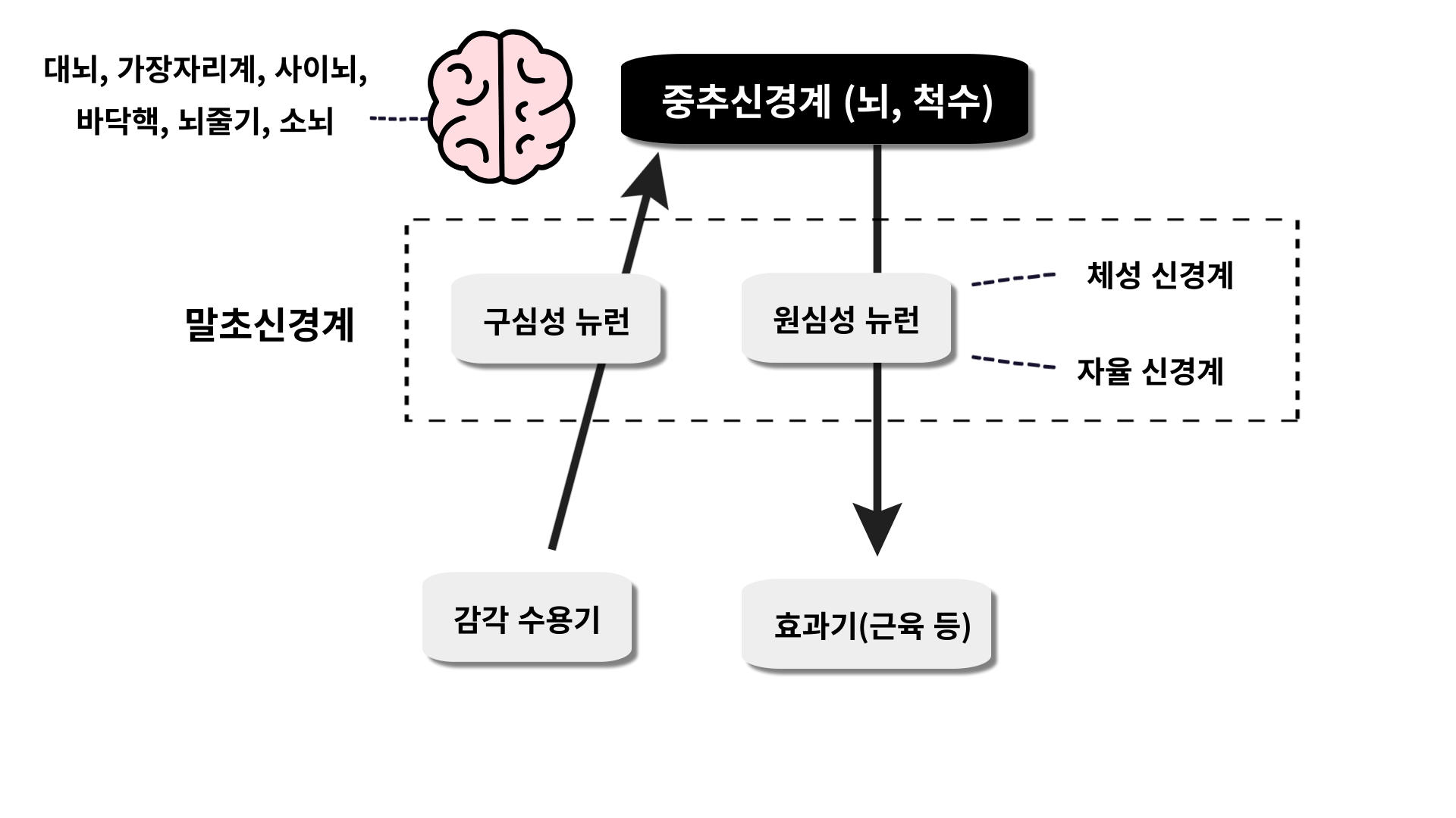 그중 중추신경계는 '감각정보'를 통합하여 판단하는 신경계로 정의되며 '뇌'와 '척수'로 구성됩니다다.