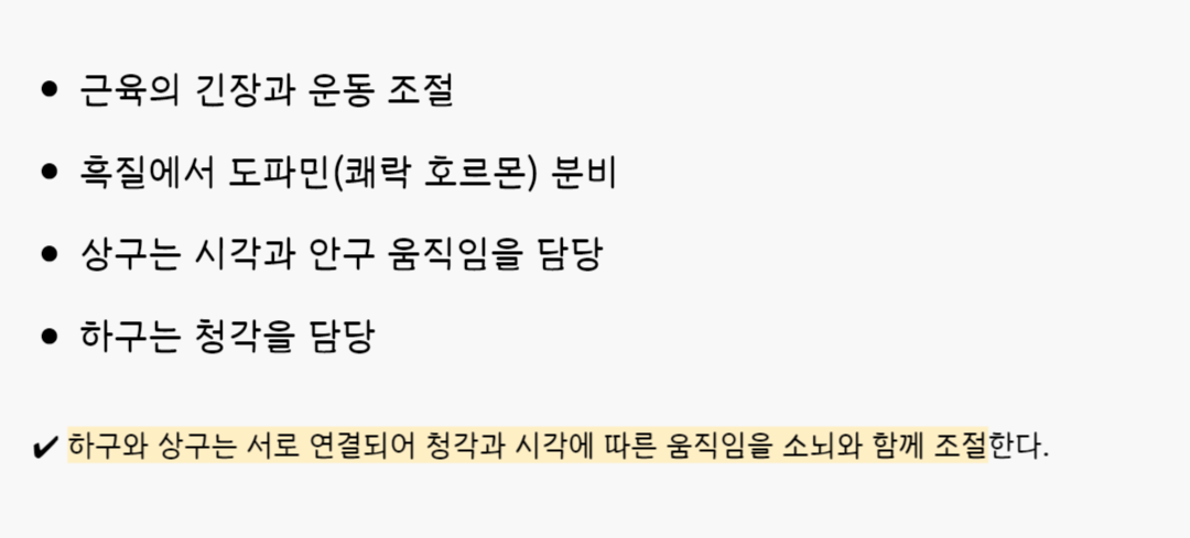 소뇌는 대뇌의 기능을 보조하여, '자발적 운동 제어'와 '몸의 균형'이 유지되도록 하는 기관으로