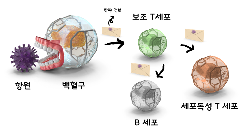 항원을 잡아먹은 백혈구가 또 다른 면역세포인 '보조T세포'에 그 항원에 대한 정보를 제공해주고,