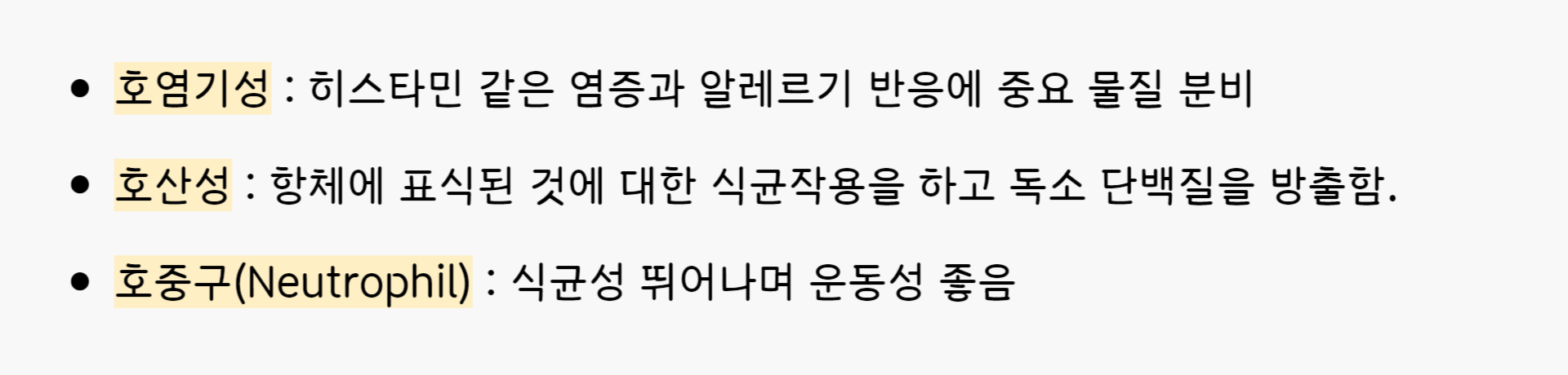 호염기구(basophil)는 식균작용은 하진 않지만 화학물질을 통해 면역 반응 조절을 돕습니다.