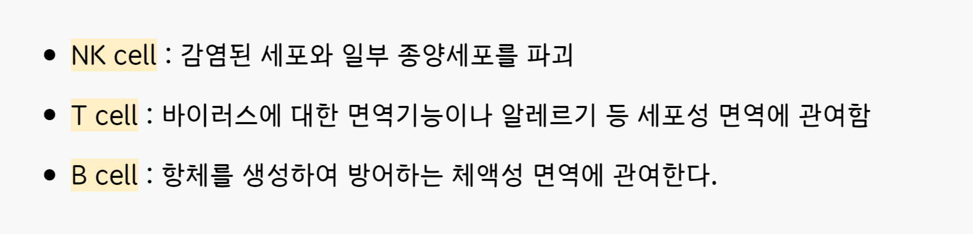 림프구 중 NK cell은 식세포군((대식세포, 호중구 등)과 함께 비특이적인 선천면역(식균 작용, 염증반응 등)을 담당하지만