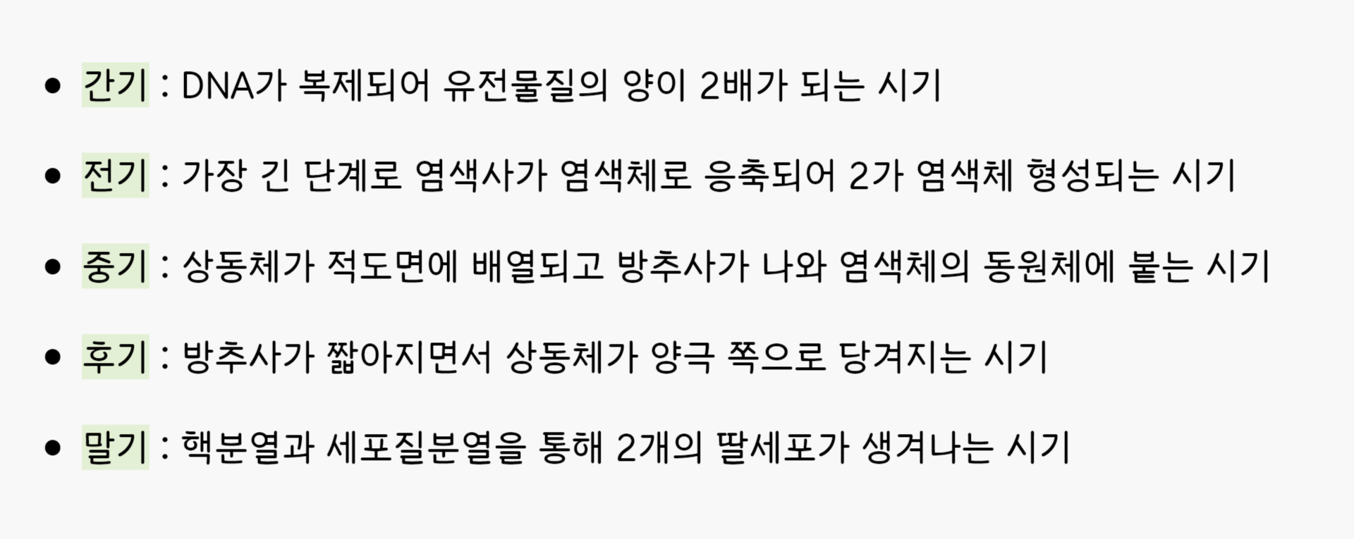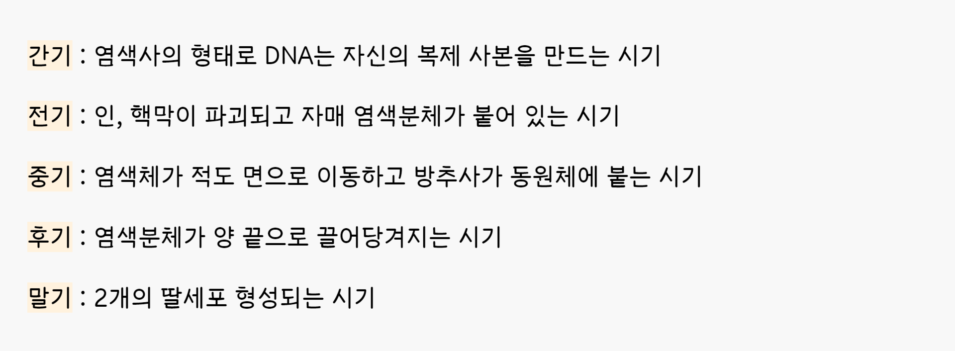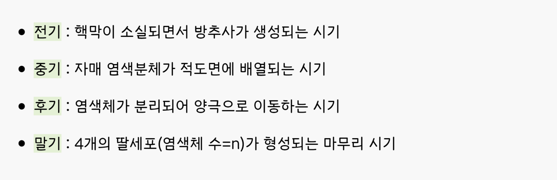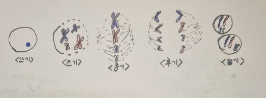 분열 과정은 2n -> 2n이며, 다음과 같이 간기, 전기, 중기, 후기, 말기로 진행됩니다.