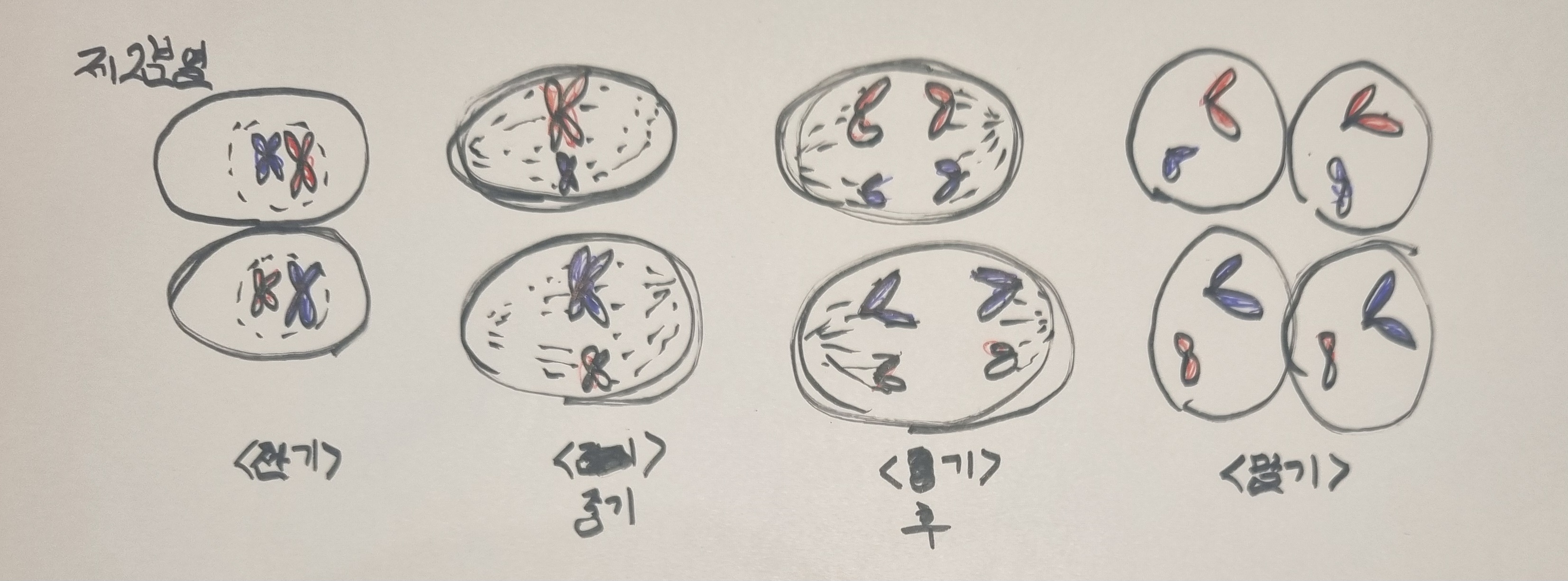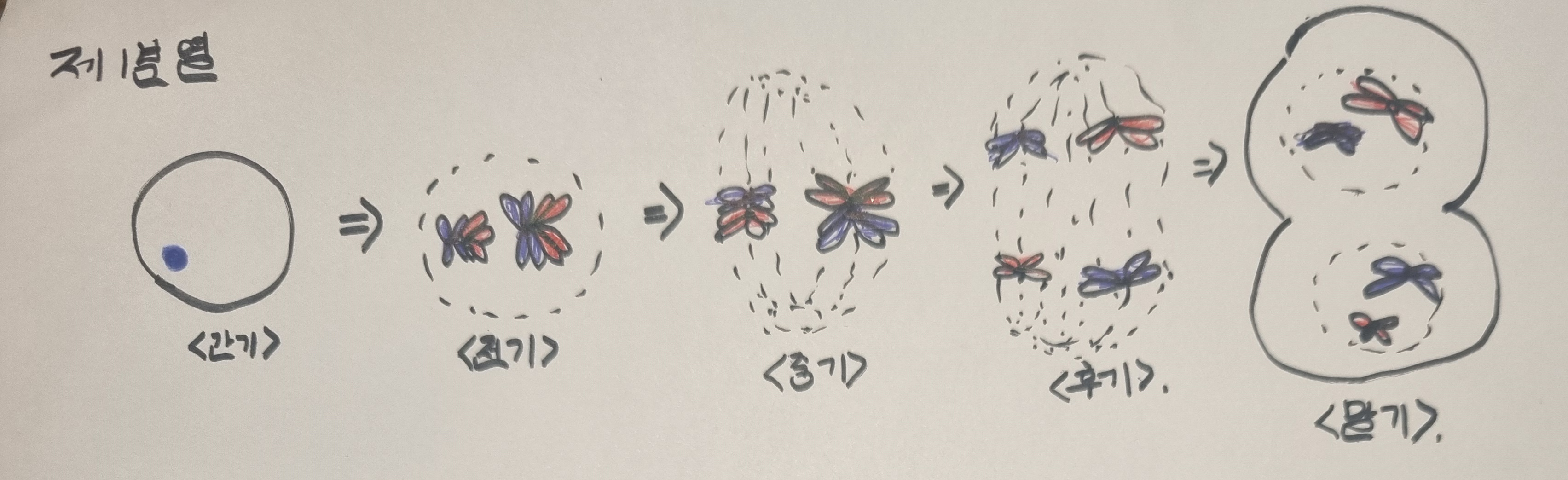 분열 과정은 제1분열(2n -> 1n)과 제2분열(1n -> 1n)로 구분됩니다.