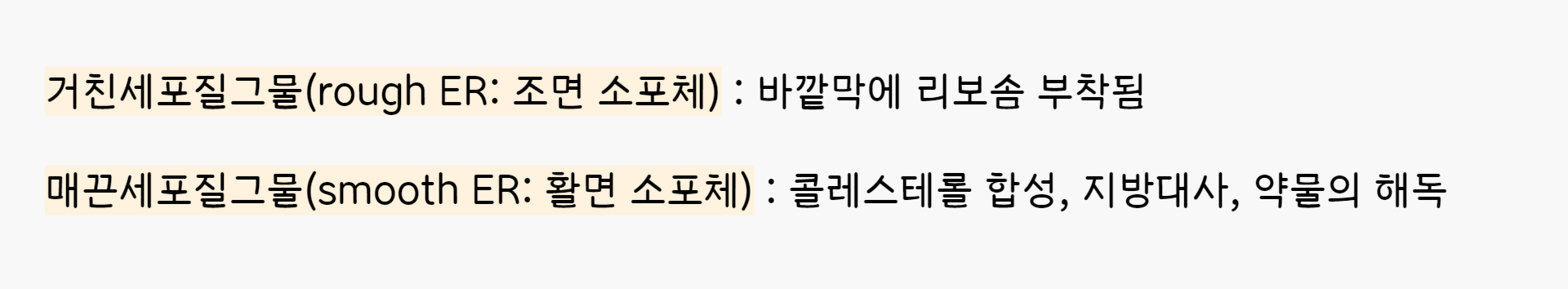 많은 양의 단백질을 축적 및 보관하는 망상 구조물로, rough ER과 smooth ER로 구분됩니다.