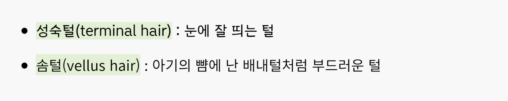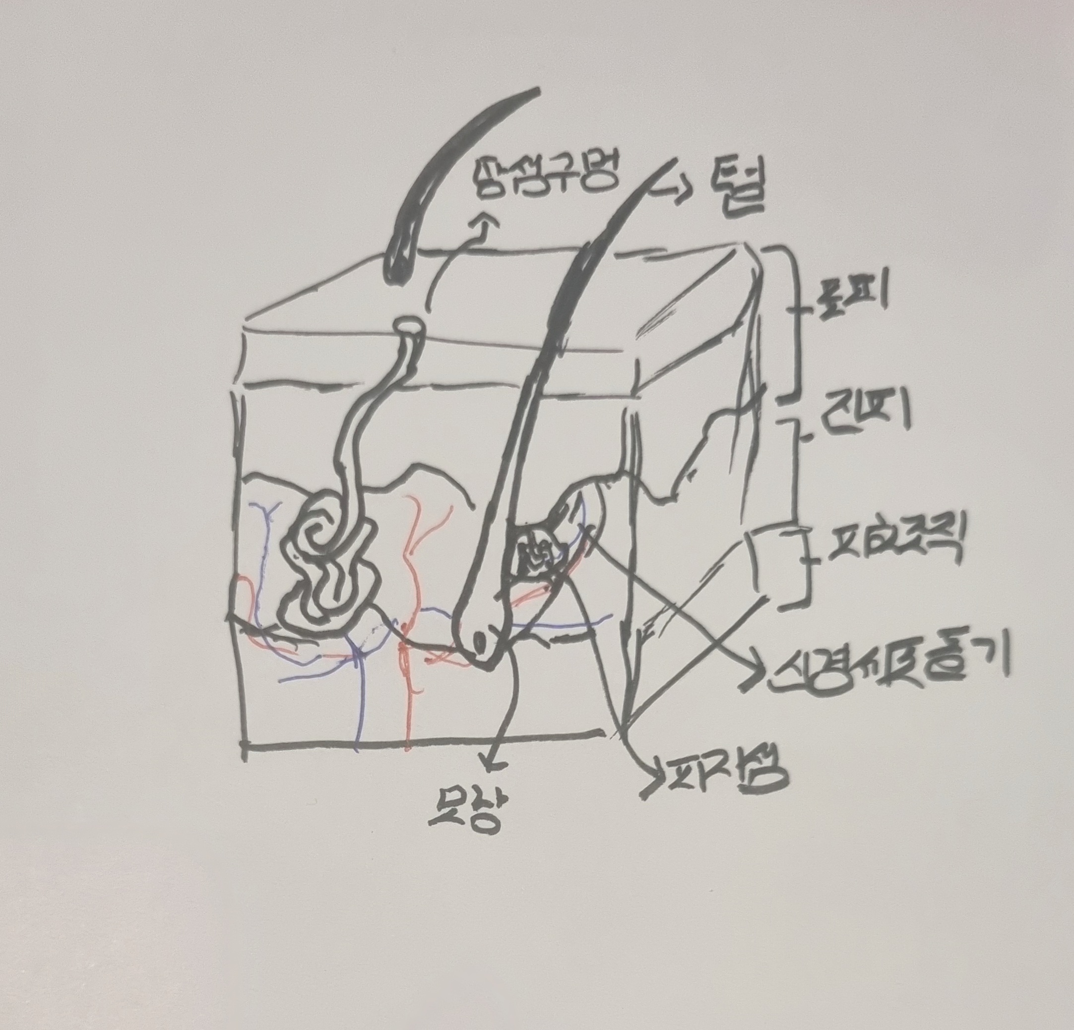 우선 피부는 털이 있는 피부와 털이 없는 피부(입술, 유두, 생식기, 손바닥과 발바닥)로 구분할 수 있는데요,