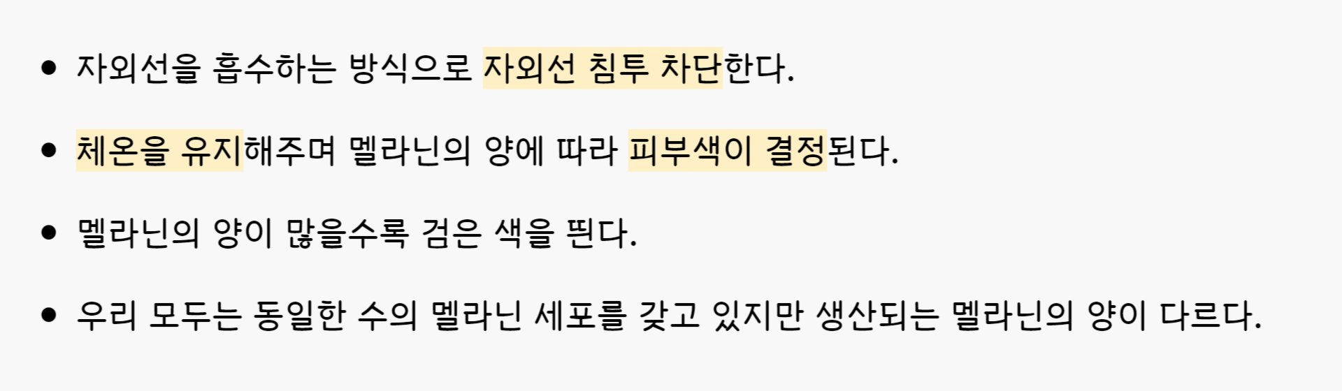 또한, 표피에서는 '멜라닌'이 생산되는데 이 멜라닌은 피부, 털 등에 색깔을 입히는 흑갈색 색소입니다.