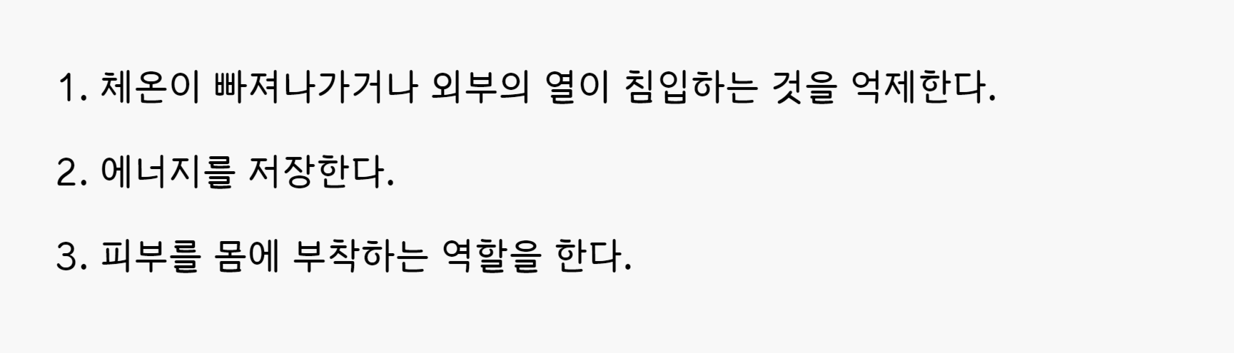 넷째는 항상성 유지(체온 조절, 수분 소실 억제, 소량의 노폐물 배출 기능),