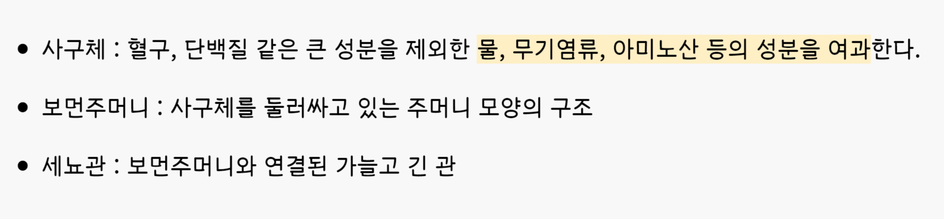 : 사구체(golmerulus) + 세뇨관(renal tubule) + 보먼주머니(bowman's capsule)