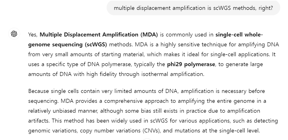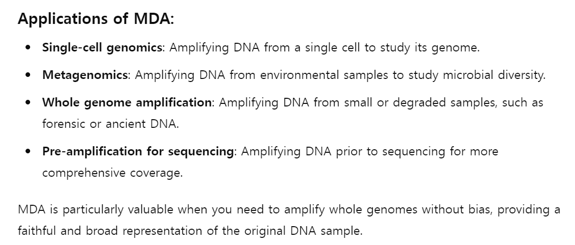 챗GPT에게 MDA의 적용 가능성을 물어보았더니 DNA 증폭을 통해 singe cell의 genome, microbial diversity 등을 연구할 수있는데 도움을 준다고 하는 것 같습니다.