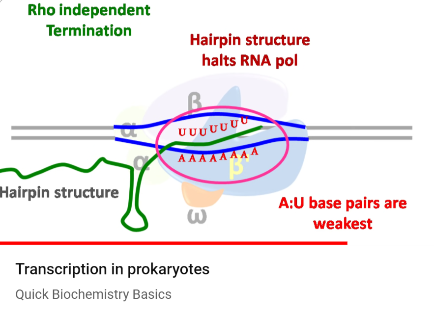 Rho independant termination의 경우 GC-rich rigeon이 hairpin 구조를 형성하여 RNA polymerase를 멈추게 한 후