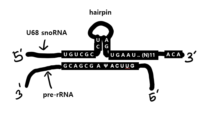 설명하자면, hairpin을 가진 U68 snoRNA와 pre-rRNA 사이의 RNA-RNA duplex가 형성되고, 이는 uridine을 pseudouridine으로 전환하게 되고,