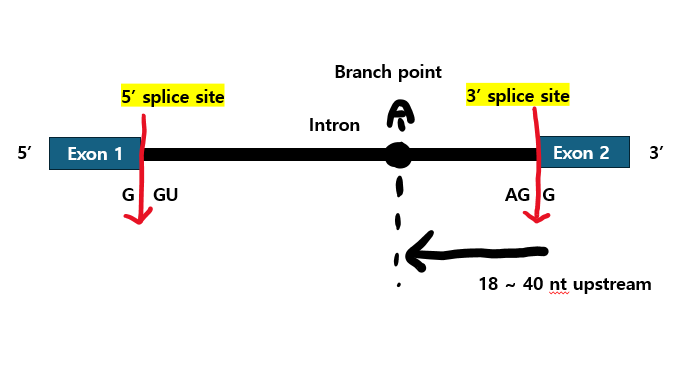 또 다른 보존 서열로 'branch point'라고 불리는게 있는데, 이는 intron의 3' end로부터 18~40 nt upstream에 위치하고 항상 adenine이 위치하기에 느슨하게 보존되어 있다3)고 합니다.