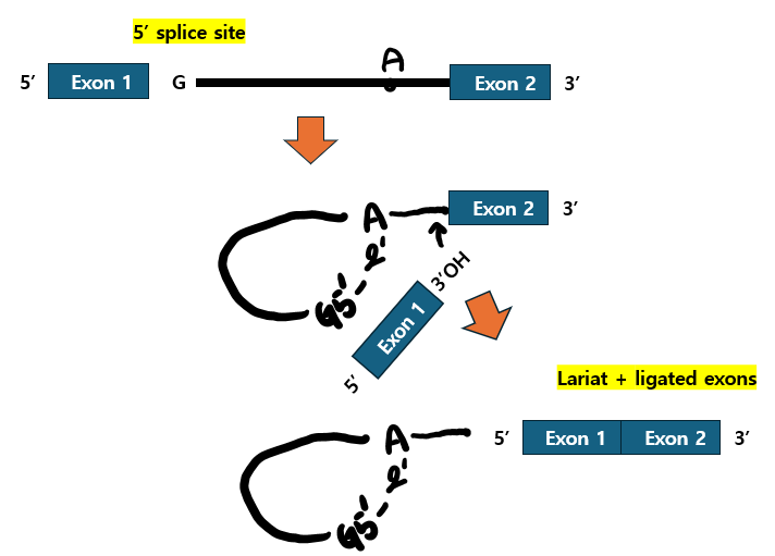 위의 이미지를 설명하자면, 우선 5' splice site의 cleavage가 이루어지고