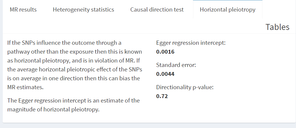 그렇지만, MR 계산에 있어서 IV assumption의 세 번째던, genetic variant가 오직 exposure을 통해서만 outcome에 영향을주는지 즉, pleiotropy(다면 발현성) 없는지 확인하기 위해 MR-Egger regression 분석도 진행을 해주어야 합니다.