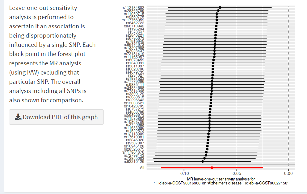 앞선 상관관계 분석값에서의 leave-one-out sensivity analysis 결과값을 보니 특출나게 틔어나온 SNPs는 없어 보입니다.