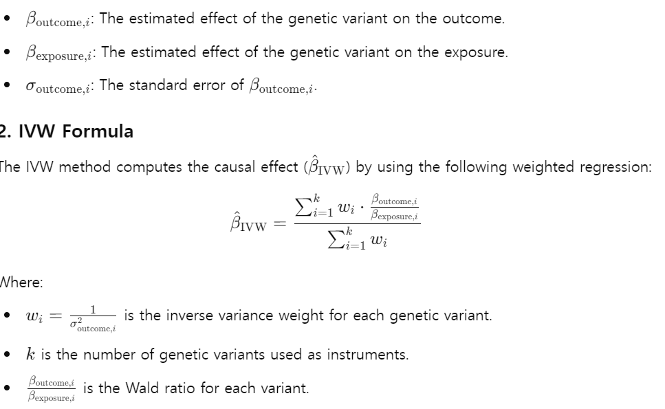 IVW는 여러 genetic variants가 특정 exposure와 관련이 있을 때 각 variant의 specific Wald ratios의 meta-analysis*를 통해 계산합니다.