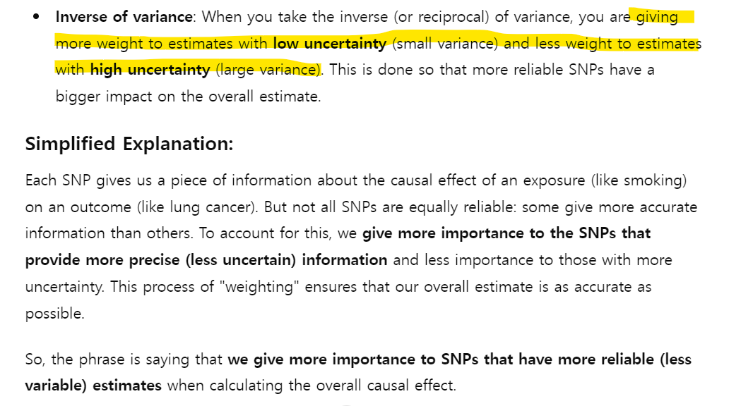 암튼 그렇게 inverse of variance로 정확도를 높여 overall causual effect를 weighted SNP casual effects의 합으로 계산하기 때문에 그런 이름으로 정했다고 합니다 4).