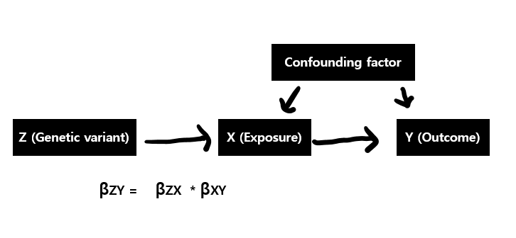 기본적으로 exposure(X)의 outcome(Y)에 대한 causative effect를 계산하는 쉬운 방법은 Wald ratio를 활용하는 것인데