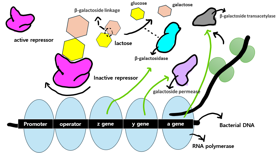 즉, RNA polymerase가 repressor의 방해 없이 bacterial DNA로부터 mRNAs를 전사할 수 있게되고, 그로부터 lactose의 양을 줄이는 효소 단백질들이 합성되는 것입니다.