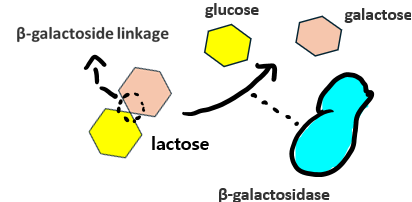 앞서 소개된 β-galactosidase는 촉매 반응으로 Lactose의 두개의 당(glucose, galatcose)을 연결하던 β-galactoside linkage를 가수분해시켜 연결을 끊습니다.
