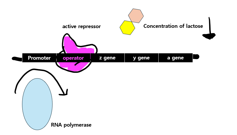 그렇게 lactose의 농도가 낮아지게 되면, active repressor가 operator에 붙게 될 가능성이 높아지게 되고, 그렇게 붙게되면 promoter에 RNA polymerase가 붙지 못하게 되어 lactose의 양을 줄이는 효소의 합성이 이루어지지 못하게 됩니다.