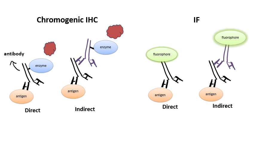 다시 말해, chromogenic IHC는 항체가 항원에 결합하면 항체에 붙어있던 효소가 활성화되어 기질이 붙을 수 있어 발색 물질을 생성할 수 있다면, IF는 항체가 항원에 결합하면 항체에 붙어있던 형광단이 활성화되어 빛을 조사했을 때 형광을 나타내게 되는 것입니다.