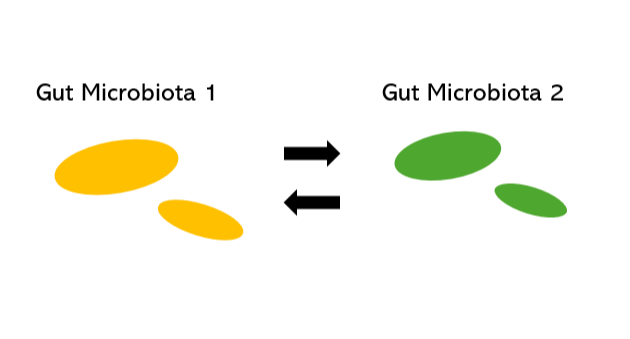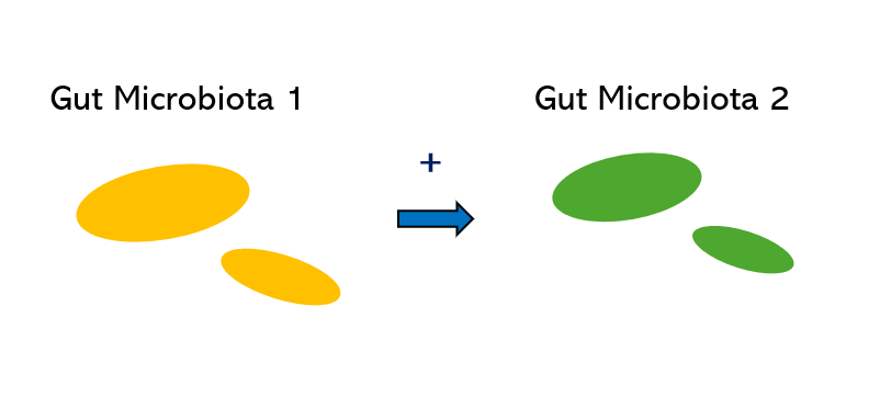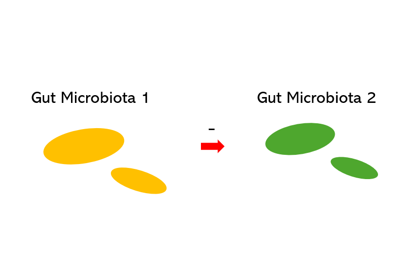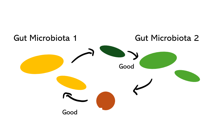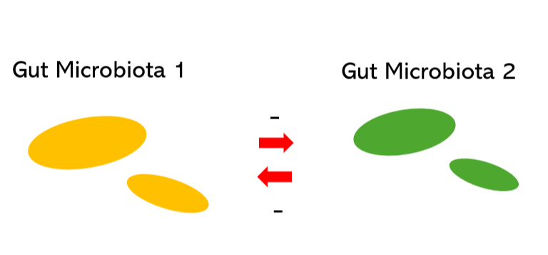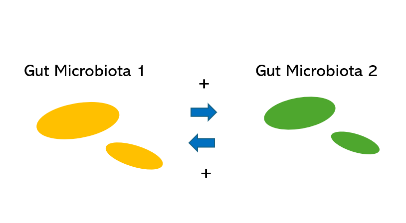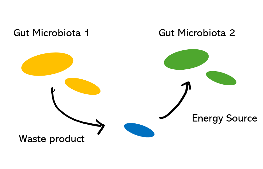 이러한 관계는 특정 미생물(giver)이 다른 미생물(consumer)에게 giver에겐 필요 없는 무언가를 제공해주는 관계로 볼 수 있는데, 예로 장내 미생물 2가 장내 미생물 1의 대사산물이나 부산물(water product)로 생장(growth)하는 경우2)가 있습니다.