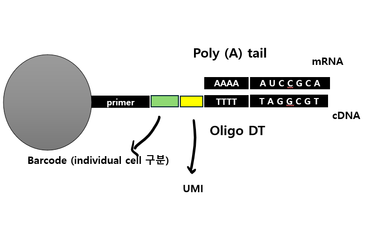 위 이미지에서 처럼 cDNA가 reverse transcription을 통해 합성되고 나면, 새로 생긴 cDNA를 PCR로 증폭(amplification)시키고, 정제하고, 시퀀싱에 필요한 adapter와 index를 양쪽 말단에 추가합니다. 여기서 또 새로 알았던 게 NGS 분석에서 하나의 cDNA에 대해 두 개의 read를 구분해서 분석한다는 점이었습니다. 무슨 말이냐 하면 특정 transcript에 대해 read 1에선 cell identity(barcode)와 gene quantifiaction(UMI) 관련 정보가 들어가고, read 2에는 transcript의 정보가 들어가는, 그래서 정보가 분리되어 해독된다는 점이었습니다.
