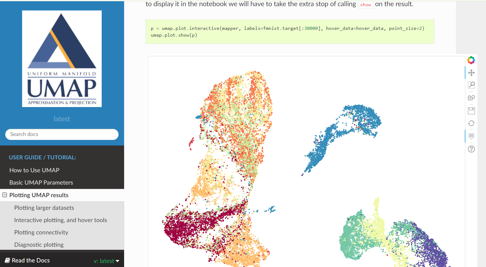 아래 UMAP 사이트(글자 클릭 시 이동)에선 UMAP을 해볼 수 있는 코드와 적용할 수 있는 예제를 제공해주고 있는데, 시간 될 때 한번 예제로 해봐야겠습니다.