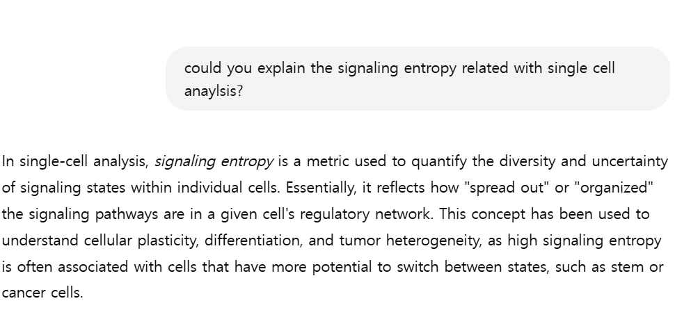 Signaling Entropy에 대한 ChatGPT의 설명은 위와 같은데요, 높은 signaling entropy일수록 세포의 states 사이의 전환할 수 있는 potential이 더 높은 세포인 Stem cells나 Cancer cells와 관련이 있다는 설명인 것 같습니다.