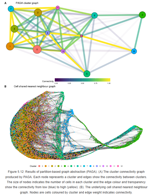 여기서 위의 Figure A에서 동그라미인 node가 'cluster'를 의미하고, 동그라미를 연결하는 'edge'는 cluster 사이의 connectivity를 의미하며, edge의 색깔이 파란색에 가까워질수록 connectivity가 약해지고, 노란색에 가까워질수록 connectivity가 강해진다고 볼 수 있습니다. 그리고 node에 있는 숫자는 clusters에 속한 cells의 수라고 합니다.
