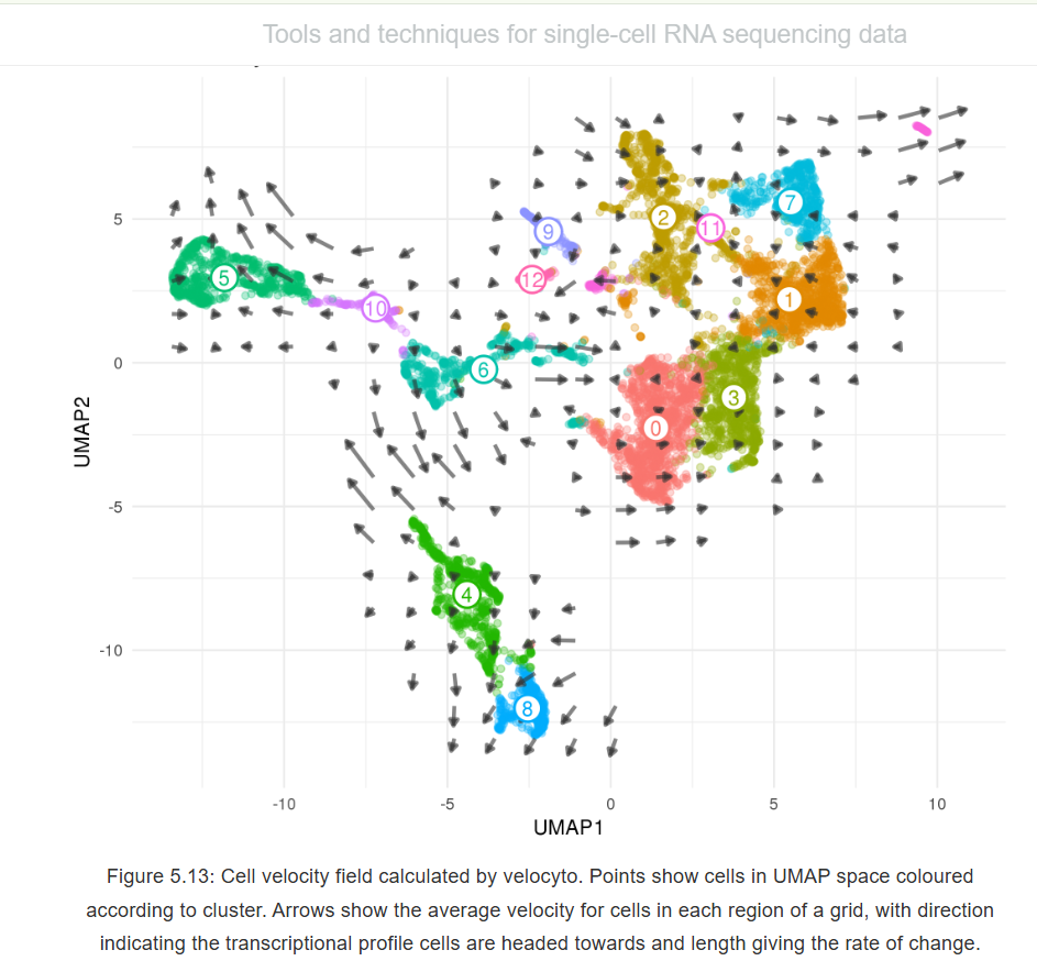 참고로 이에 더해 cell velocity를 계산하는 방식을 통해 각 세포마다 transctriptional direction을 파악할 수도 있습니다. 즉, 특정 툴을 활용하면 transcriptional profile cells가 어느 방향으로 향하는지 화살표로 표현하는 것은 물론, 화살표의 길이로 변화 속도를 나타낼 수 있습니다. 아래 이미지를 참고하시면 되겠습니다. 어떻게 이런 툴을 만들었는지 이해하고 학습하는 것도 도움이 되겠지만, 요즘엔 이런 툴이 무엇인지 이해하고 어떻게 활용해볼지 고민해보는 데 시간을 투자하는 것이 더 좋은 학습 전략이 되지 않을까 싶습니다.