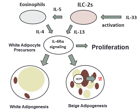구체적으로 ILC-2(Group 2 innate lymphoid cell)에 사이토카인 IL-33을 처리했을 때 ILC-2의 증가는 물론, IL-5 분비가 촉진되는에 이는 호산구(Eosinophil)의 IL-4 분비를 촉진하고, ILC-2는 IL-13를 분비하여 백색 지방전구세포의 IL-4Rα signaling을 활성화합니다.