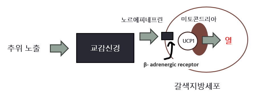 정리하자면 추위에 노출되면 교감신경(sympathetic nerve)이 노르에피네프린(Norepinephrine)의 분비를 촉진하고, 이는 지방세포의 β- adrenergic receptor를 통해 PKA-CREB/P38 MAPK 신호전달 경로를 활성화하여, 미토콘드리아의 수를 증가시켜 UCP1과 열 발생 핵심 단백질들의 발현을 증가시키고, 그럼으로써 추위에 저항하는 열이 생성됩니다 3).