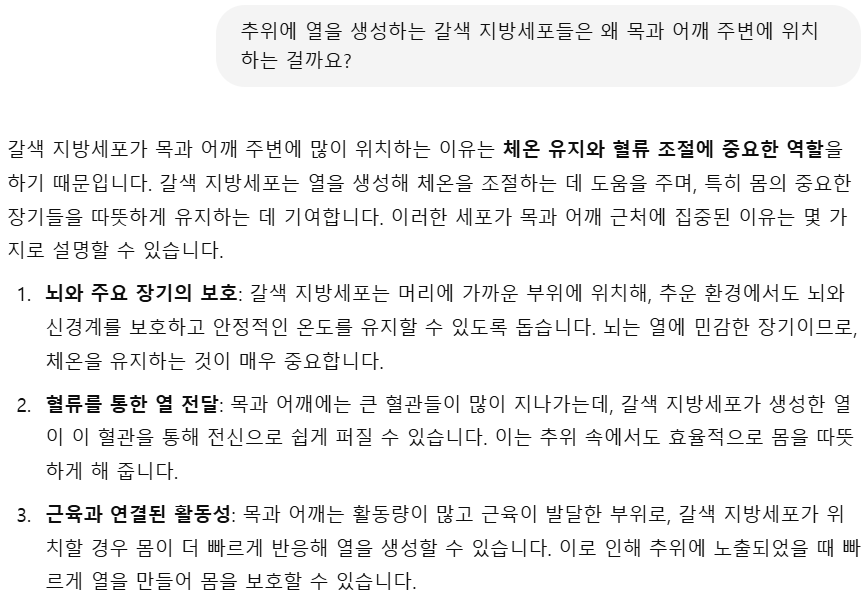 그렇다면 추위에 열을 생성하는 갈색 지방세포들은 왜 목과 어깨 주변에 위치하는 걸까요? 잘 몰라서 챗GPT에게 물어봤는데, 다음과 같이 답해주었습니다.