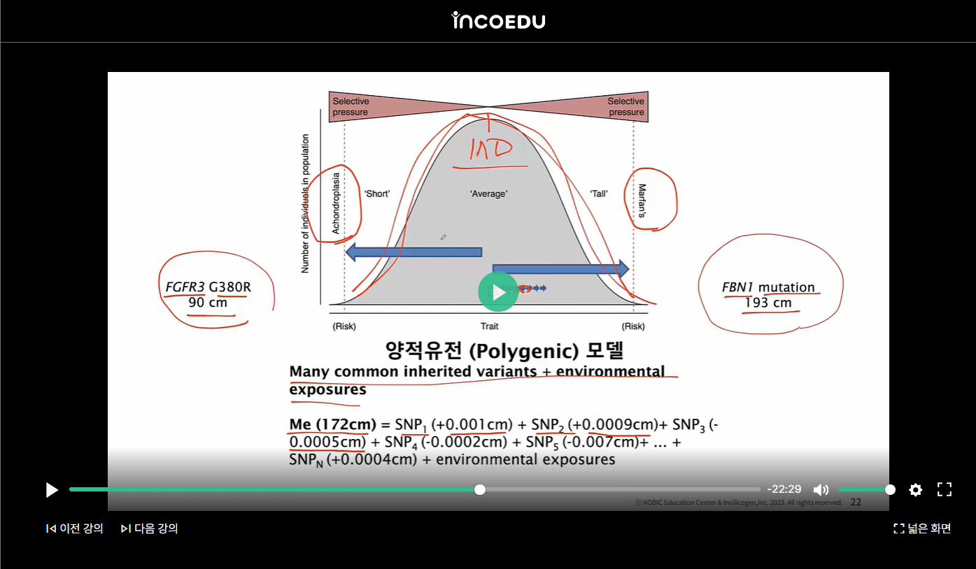 즉, "키에 관여하는 여러 개의 SNP들 중 SNP1은 '+ 0.001cm', SNP2는 '+0.0009cm', SNP3 (-0.0005cm) ~~~ + 환경적 요인" 이렇게 키가 결정된다는 것이고, 이를 양적유전 모델(polygenic model)이라고 부릅니다.