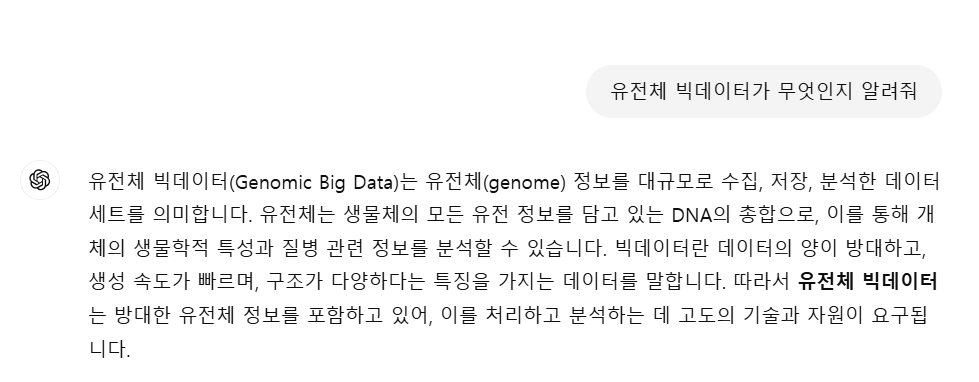 우선 '유전체 빅데이터'란 무엇인지 챗GPT에게 물어봤습니다.