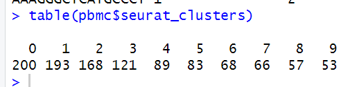 마지막 열이 세포별 클러스터인 것 같아서, table ( ) 함수로 빈도수를 보니, 다음과 같이 10개의 클러스터가 등장했습니다.