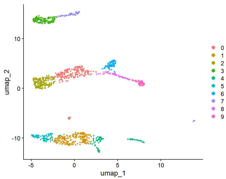 다음 단계는 UMAP 시각화를 하는 단계로, PCA 주성분 중 처음 10개를 사용해 차원을 축소하고, 세포 간 유사성을 기반으로 시각화를 해봤습니다. 시각화에는 DimPlot( ) 함수를 활용했습니다.