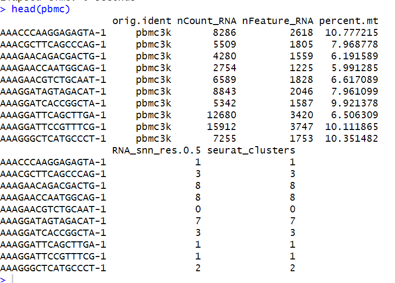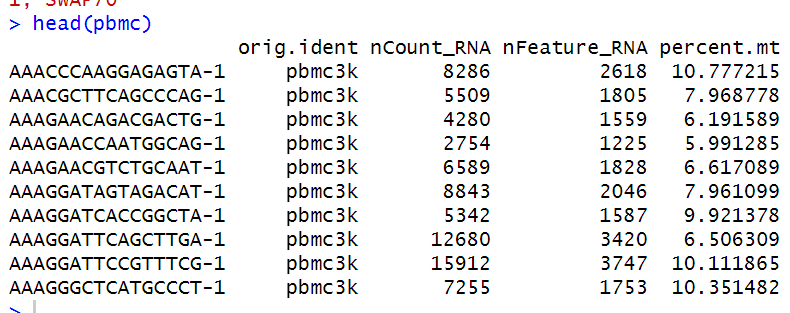 참고로 여기까지 pbmc 데이터의 head값은 다음과 같습니다.