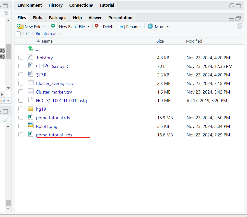 그러면 다음과 같이 앞서 전 글에서 지정했던 디렉토리에 'pbmc_tutorial1.rds' 파일이 만들어지며, 다음에 이것을 클릭하면 다시 불러올 수 있습니다.