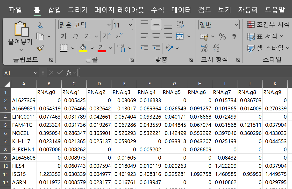 다음으로 이젠 클러스터의 특성을 보다 정밀하게 파악할 수 있도록 AverageExpression( ) 함수를 통해 '클러스터마다 유전자 평균 발현량'을 구해보고, 그것을 csv 엑셀 파일로 만들어보겠습니다.