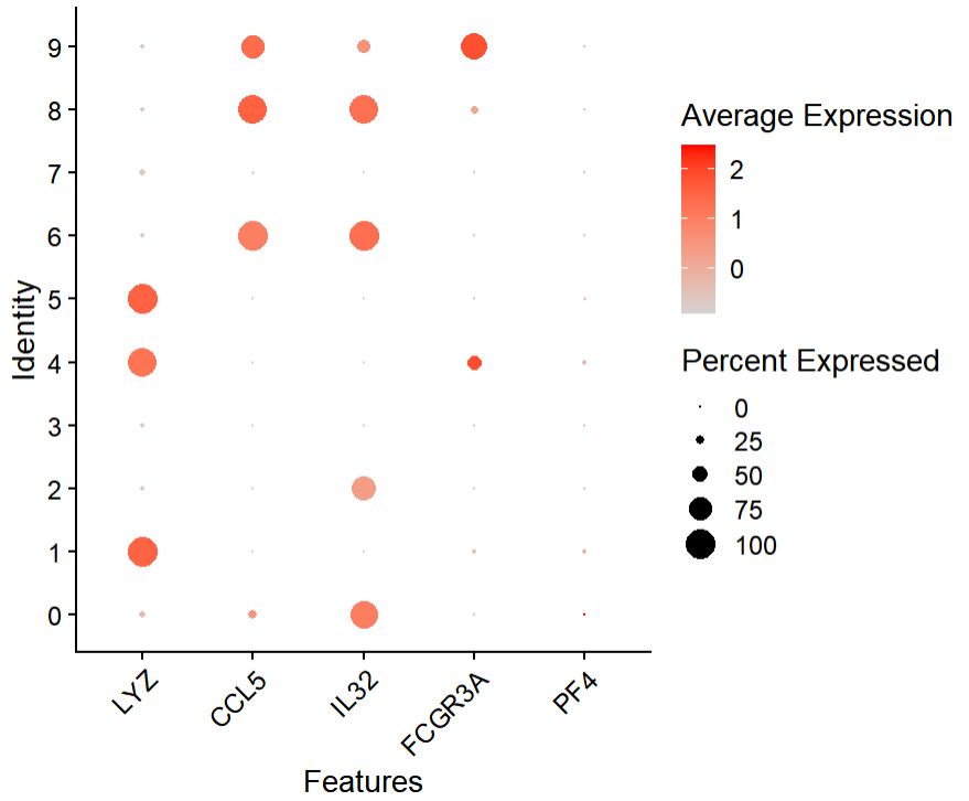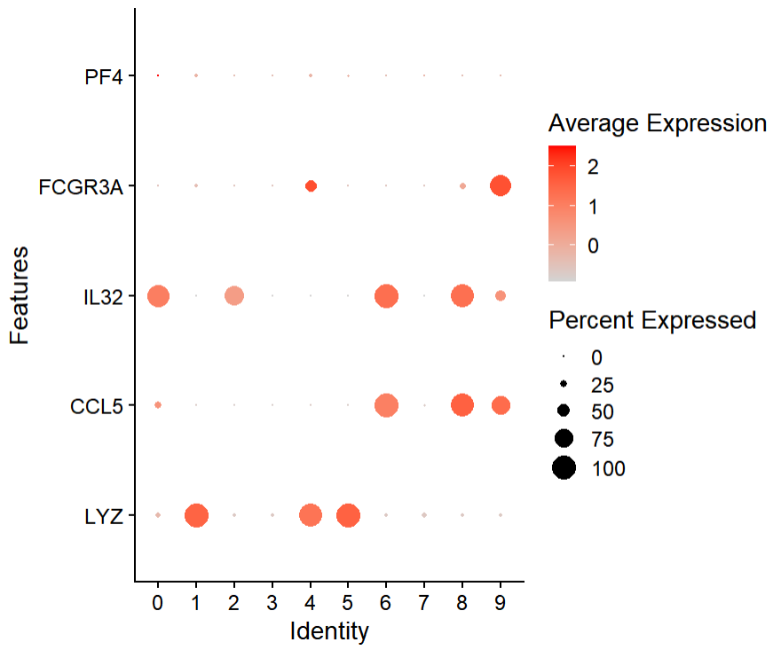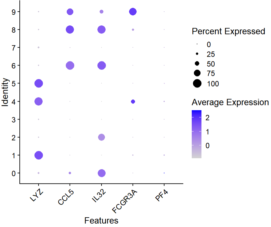 DotPlot(pbmc_tutorial1, features = c("LYZ", "CCL5", "IL32", "FCGR3A", "PF4")) + RotatedAxis()